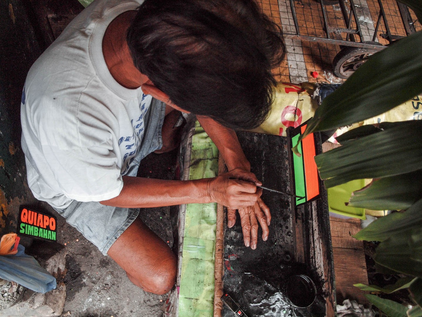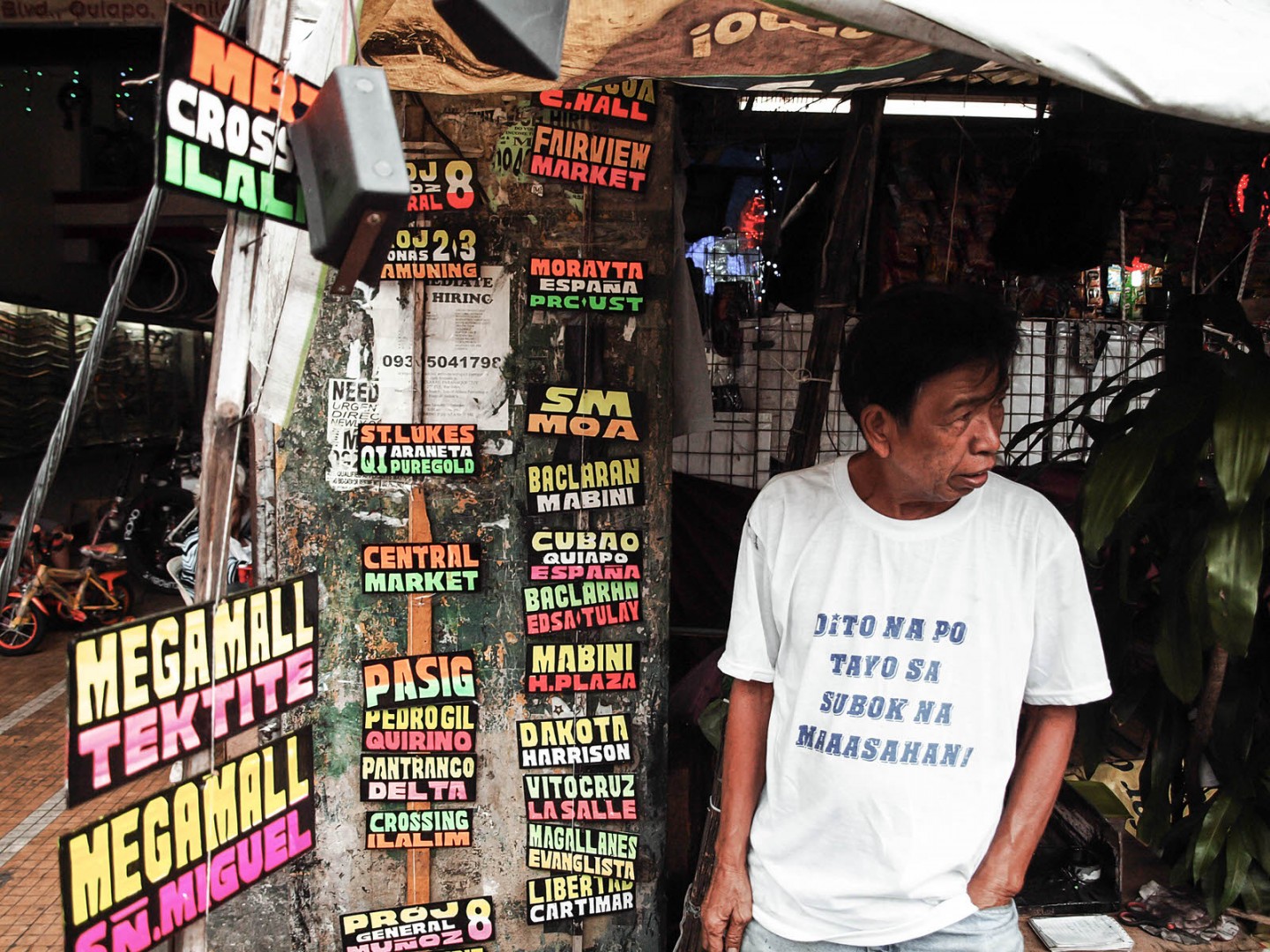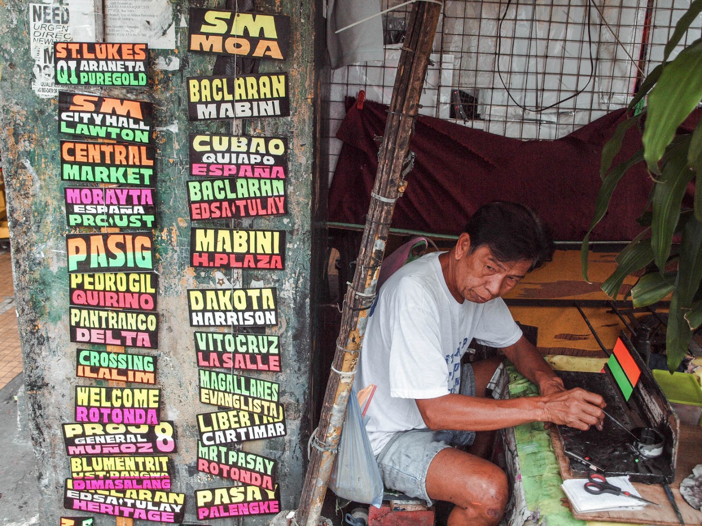 You can spot Antonio making signs near Quiapo Church along Quezon Boulevard, Manila.
