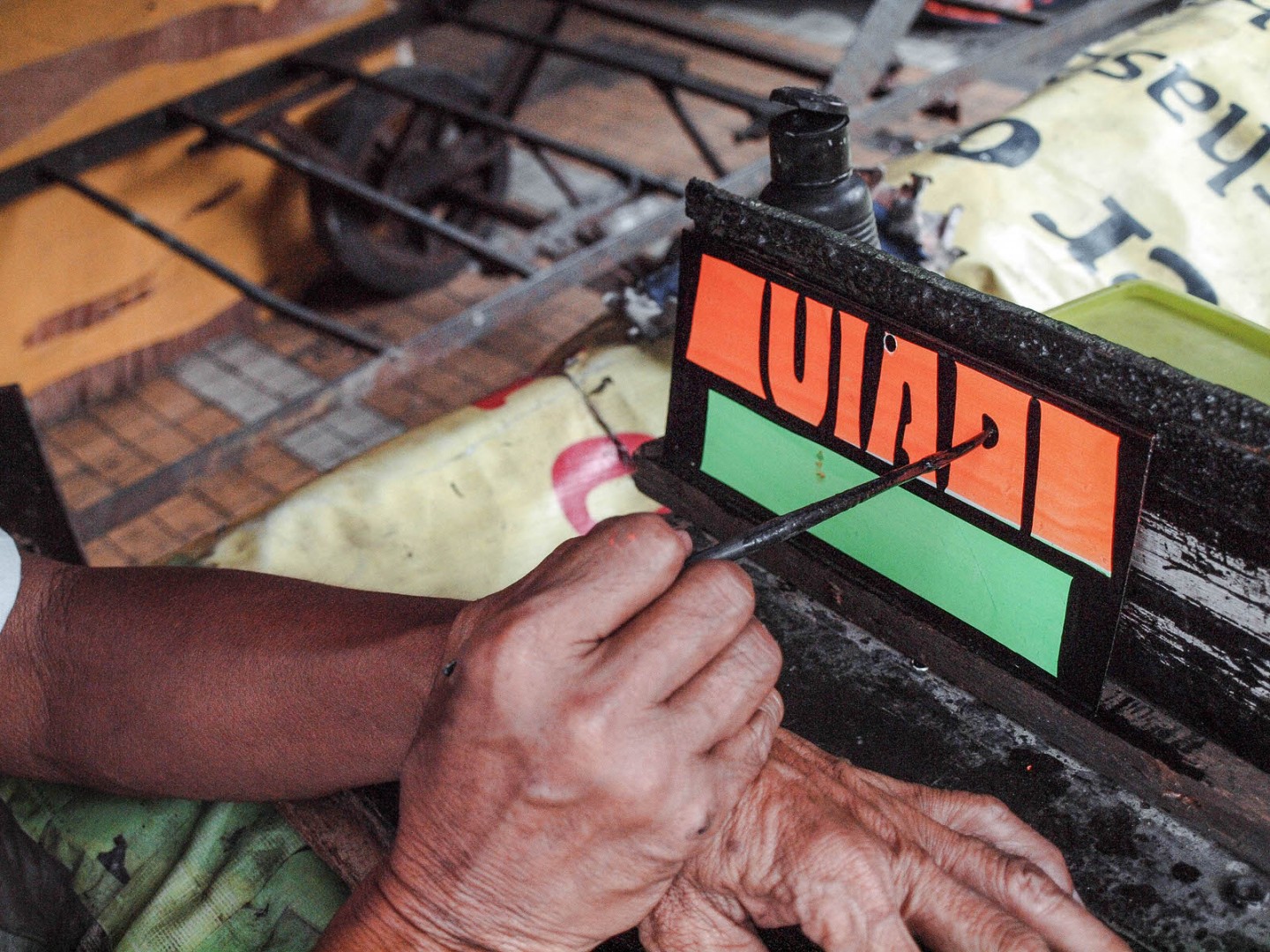 With no outlines, sketches, or drafts – he paints the sign boards all by hand. He learned by heart the routes of different jeepneys in Metro Manila and how to paint them intuitively using vibrant neon colors for visibility in the streets.