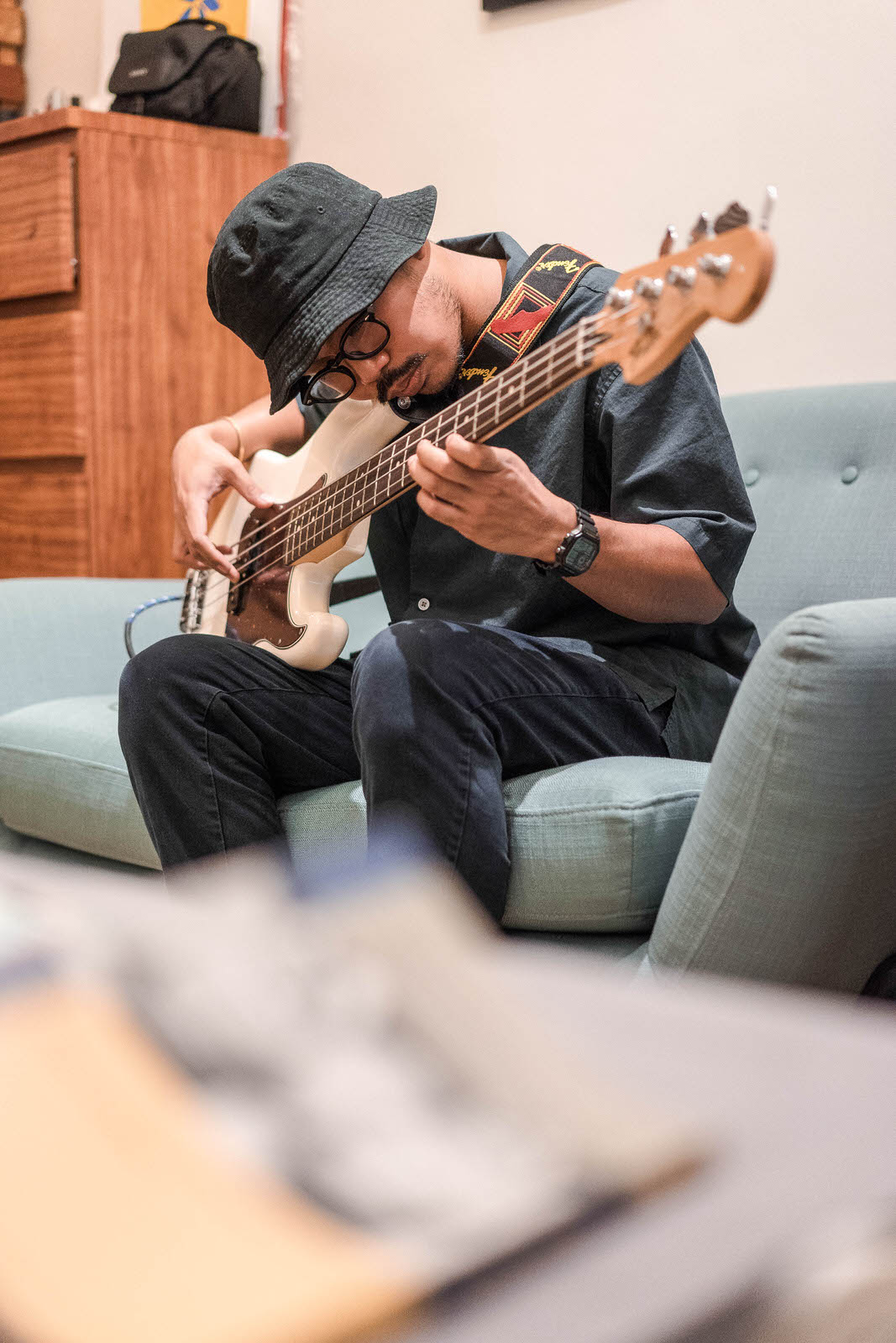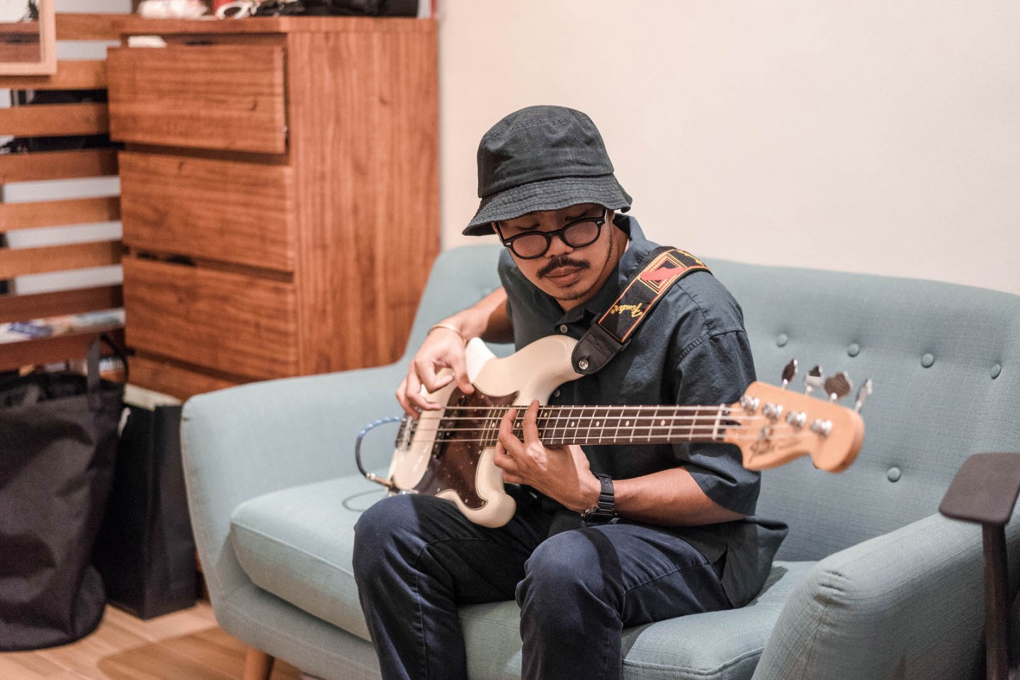 I have a more straightforward setup live that I do when I record because I’m not comfortable playing with live instruments on stage yet. I tried playing my first solo EP, Tommy Gun, with live drums in Malasimbo 2017 and it was fine. I wasn’t happy with that set, so I still have to work on that particular setup. I’m usually alone at home when I’m recording, so I’m not discouraged when I use my instruments there.