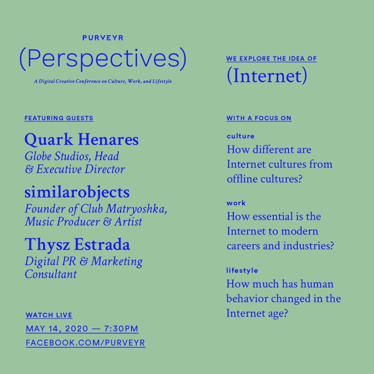 Part two of our webinar series, Perspectives, will be delving into the topic of the Internet. Given that almost everyone has free access to the Internet, it’s worth discussing the many nuances in the platform that all touch the aspect of work, lifestyle, and culture. How different are internet cultures from offline cultures? How essential is Internet to modern careers and industries? How much has human behavior in the internet changed? All these questions and more will be answered on Thursday, May 14 at 8PM through a Facebook Live session in our page.