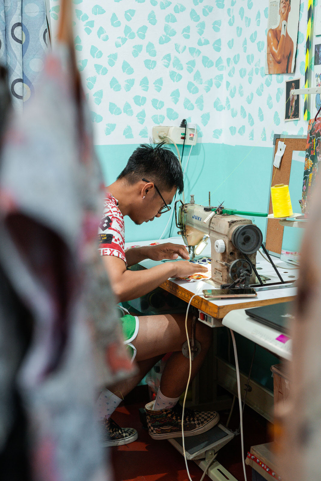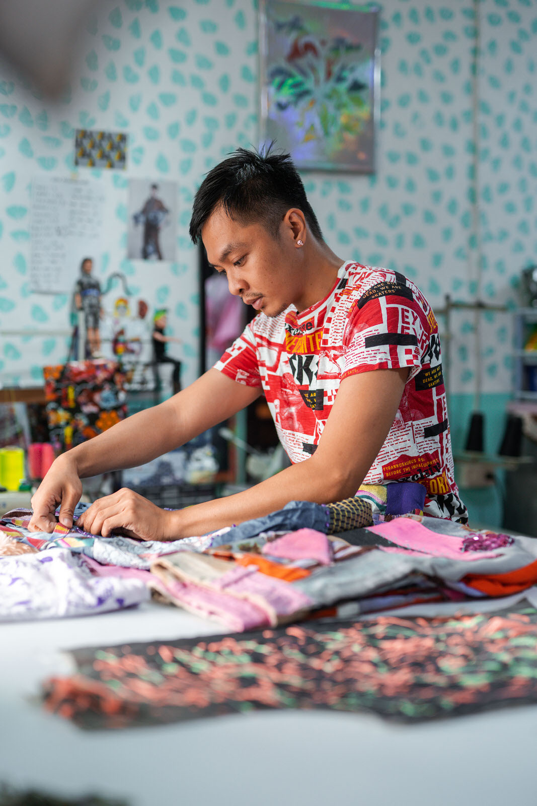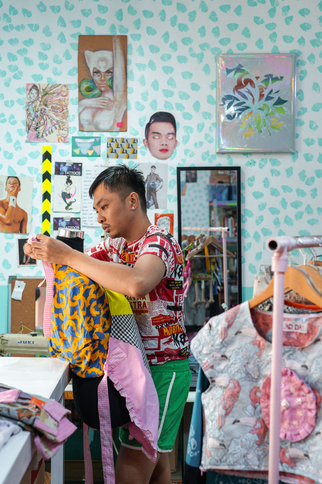 As compared to other designers who usually start their ideation process by building mood boards or starting off with a rough concept, Willar takes pride in letting his hands do the figuring out for him, whether it be spontaneously sewing pieces of fabric, or doodling odd characters, “Work [with] what you have din.” (Work [with] what you have.)