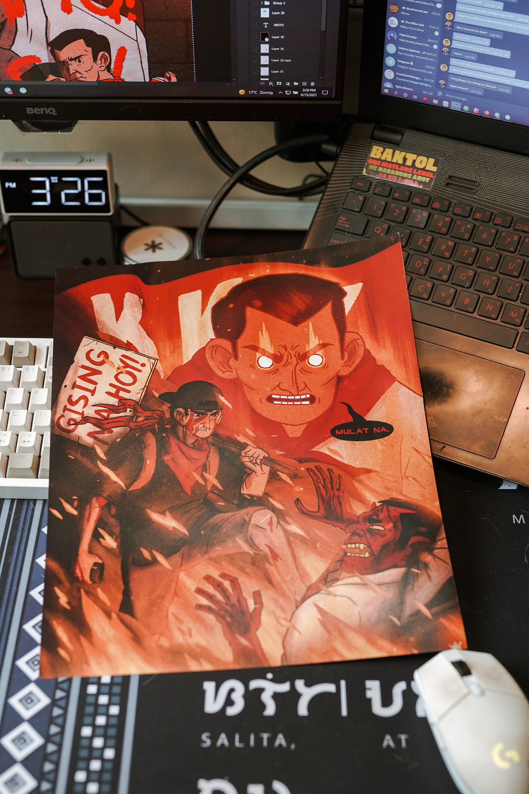 My visual style is attributable to time spent reading and researching Martial Law era political illustrations—very heavy and stylistic. I found out later on that many of the influences from other illustrations I liked took inspiration from those as well like the linear art and compositions. It was after having my own illustrations become more influential and viral that I decided to take a look through at illustrations of the past like the Martial Law illustrations and how they focused and worked on being so prominent. Thanks to the work of scanned archives at libraries, especially online archives, access to these resources was made so much easier.