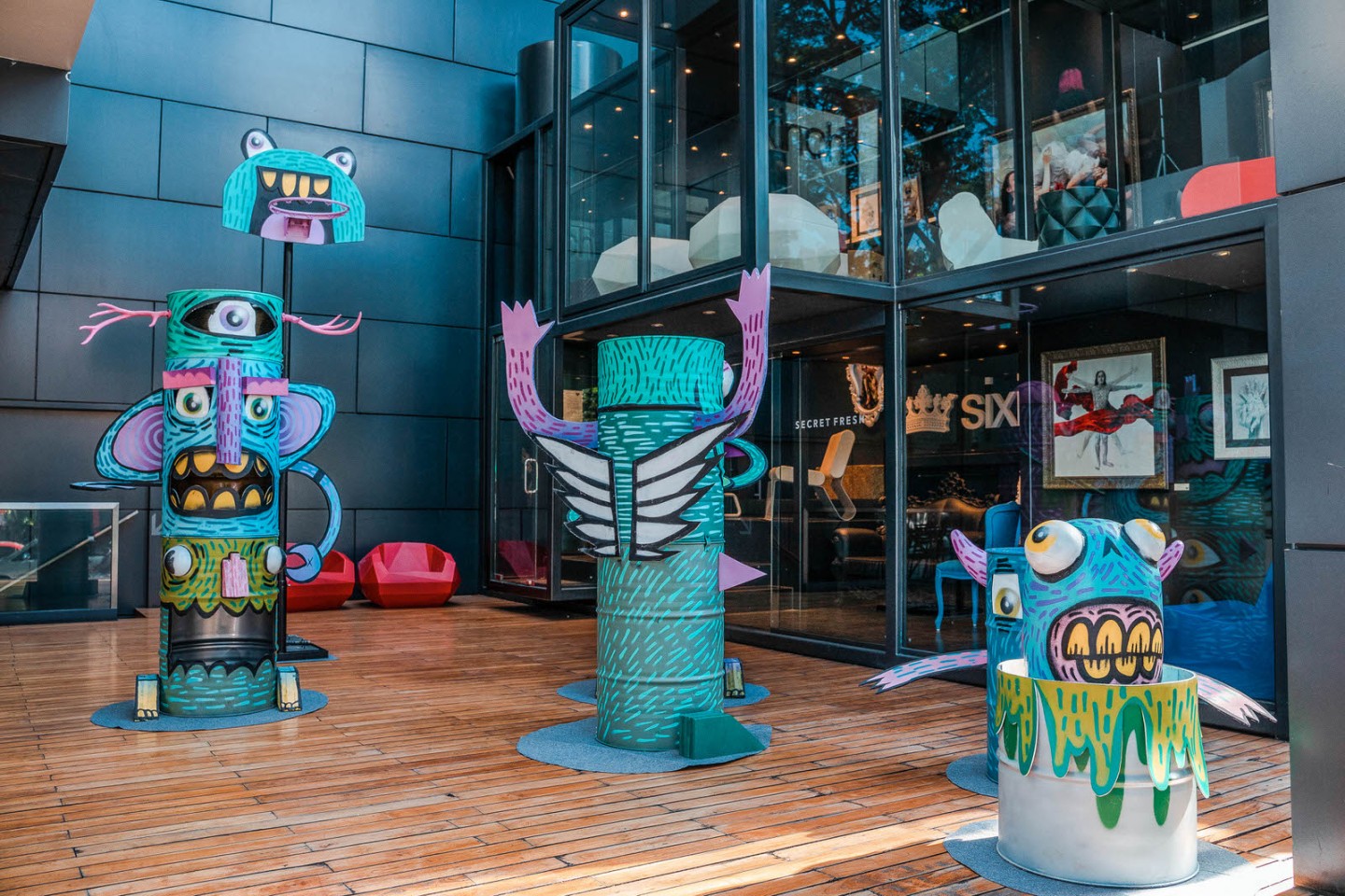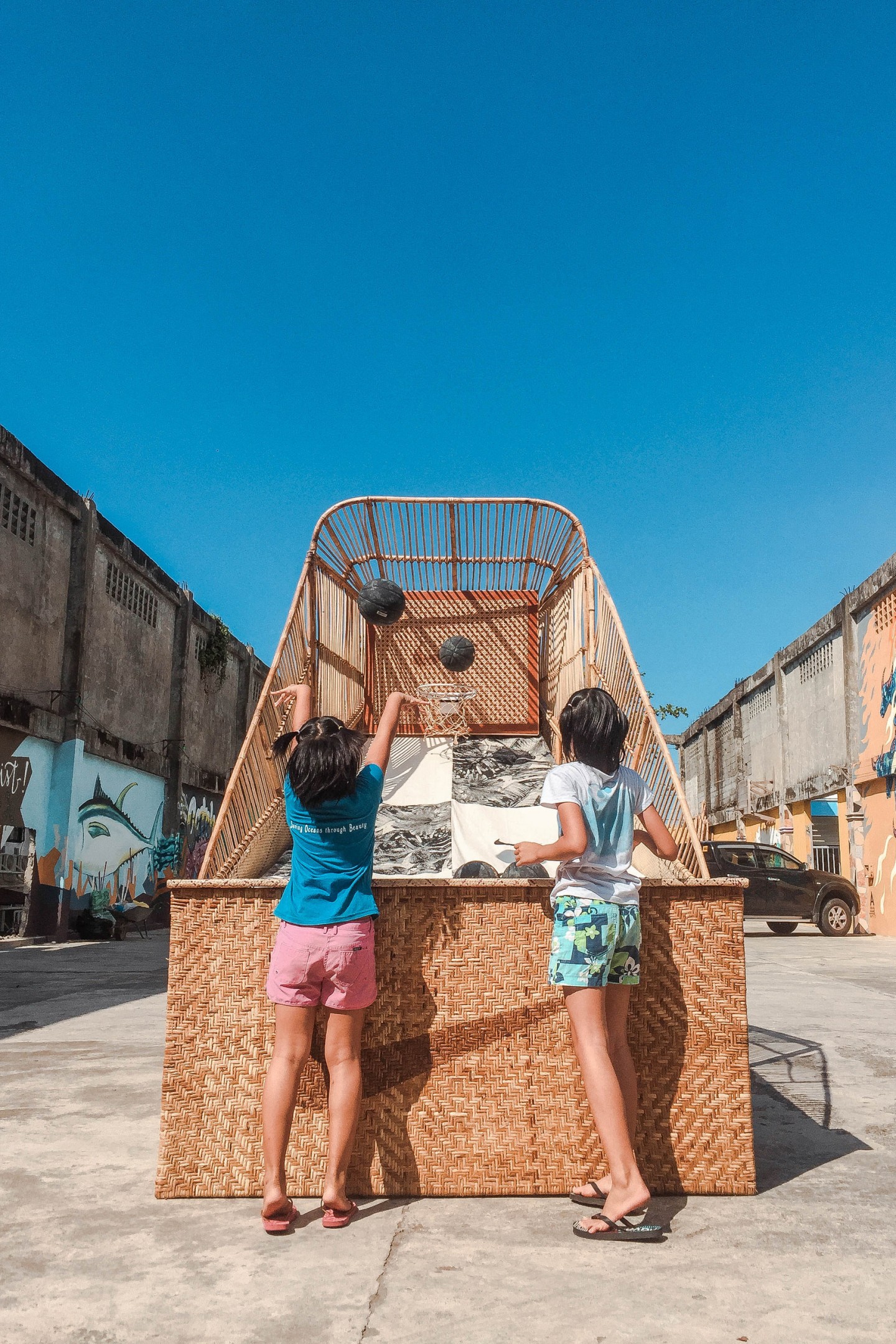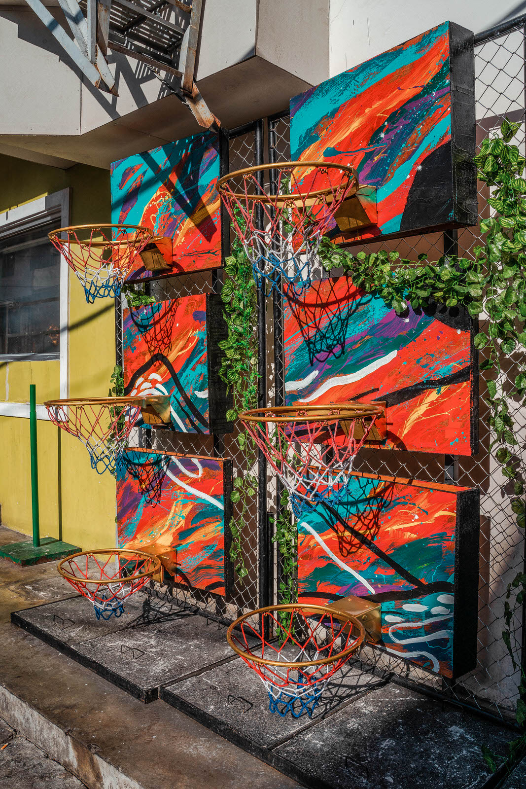 This installation replicates the makeshift street game goals and combines it with one of those other childhood staples. Use this display and try to score a tic tac toe line, or use your skills to steal a basket away!